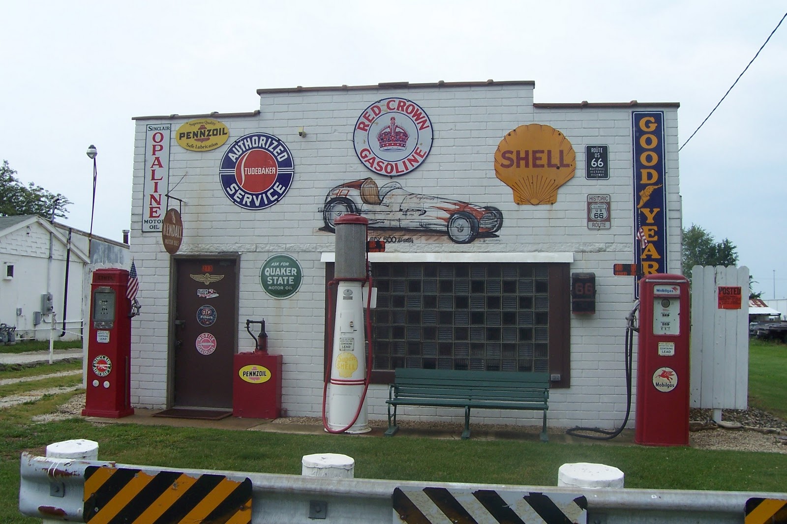 Just down the street from the Texaco station in Dwight stands this structure. As you can see, this spot is decked out in vintage gas pumps and other memorabilia.